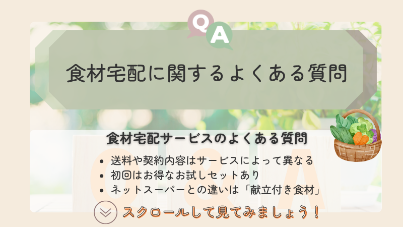 食材宅配に関するよくある質問をまとめたので、利用する際はぜひ参考にしてみてくださいね。
