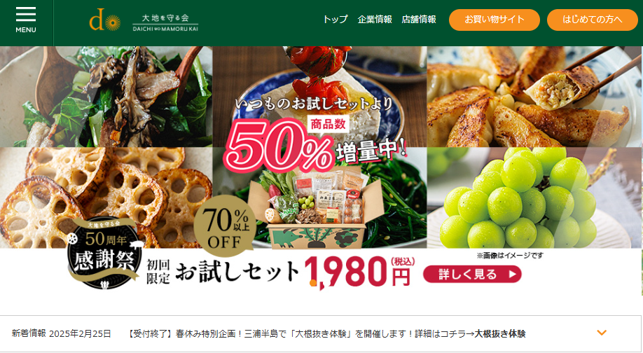 大地を守る会は、オーガニック野菜や無添加の加工品などを中心とした商品を扱う宅配サービスです。
