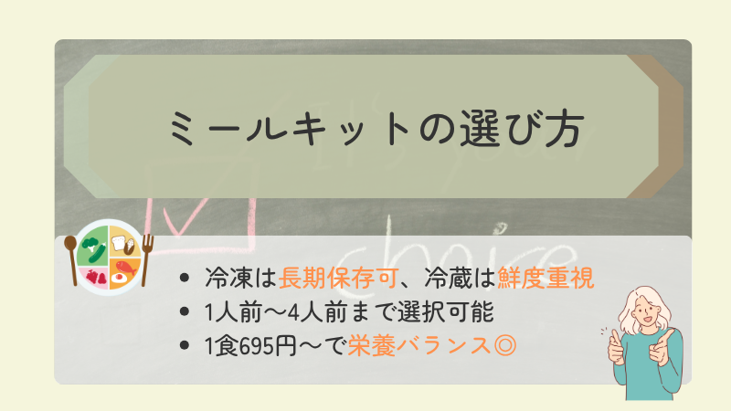 ミールキットには、冷蔵や冷凍があり、利用目的に合わせて選ぶと良いです。