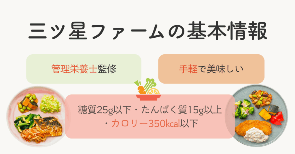 三ツ星ファームは、すべてのメニューが「糖質25g以下」「たんぱく質15g以上」「カロリー350kcal以下」です。