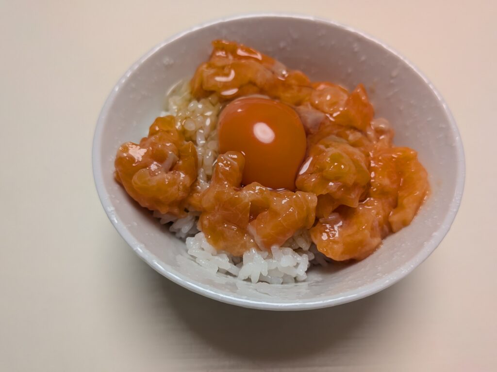 今回は、生卵をかけて食べてみました。