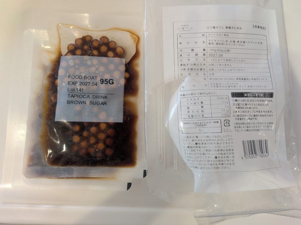 付属のカップに氷と牛乳を入れ、解凍したタピオカを入れてかき混ぜたら完成です。