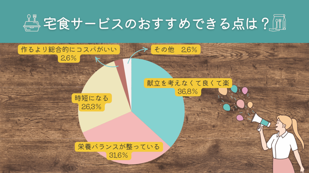 アンケートによると、「献立を考えなくて良くて楽」が36.8%、「栄養バランスが整っている」が31.6%と多くの人が選んだ選択肢でした。