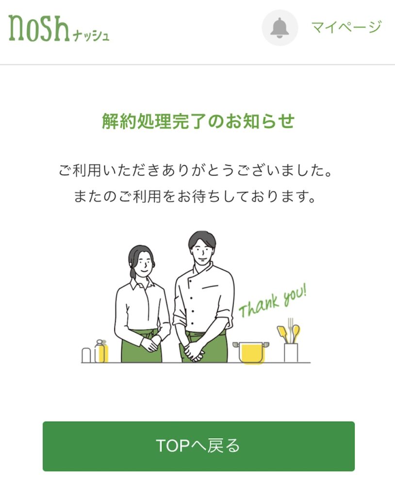解約手続きが完了すると、「解約処理完了のお知らせ」の画面に移動します。