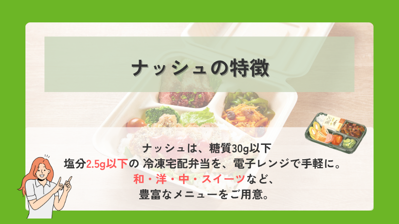 ナッシュは、忙しい日でも献立に悩まず、電子レンジで温めるだけで手軽にいただける冷凍宅配弁当です。
