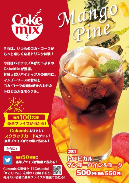 ③はずれてもTwitterでCokemixの画像と #とりでん #Cokemix をつけて写真投稿すると、毎月50名様に豪華プライズが抽選で当たる!今だけのチャンス🎁 ※後日発送